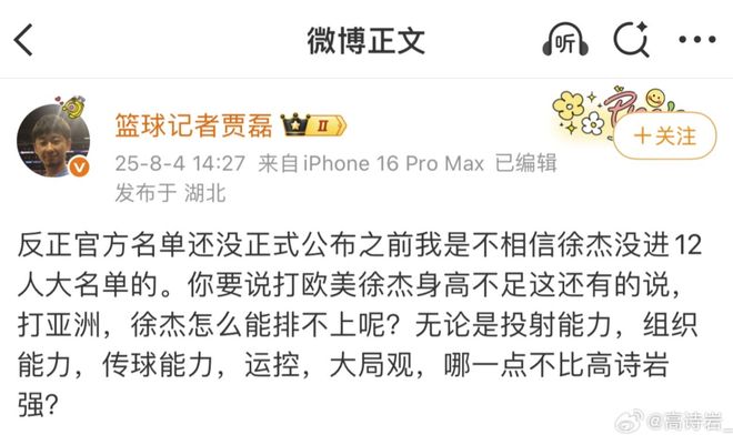 在这次名单出来之后,中国篮坛名记贾磊出来发言说:“名单没正式公布之前他是不相信徐杰没进12人大名单,你要说打欧美队,徐杰身高不足还有的说,打亚洲徐杰怎么能排不上呢?不管是投射组织传球大局观哪一点不比高诗岩强?”