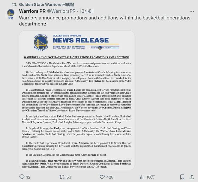 北京时间9月28日,勇士官方公布人事变动:Joe Chealey、Nikola Milojevic和Christian Terrell担任勇士视频协调员;Nicholas Kerr(尼古拉斯-科尔)成为助理教练;瑞安-阿特金森成为篮球