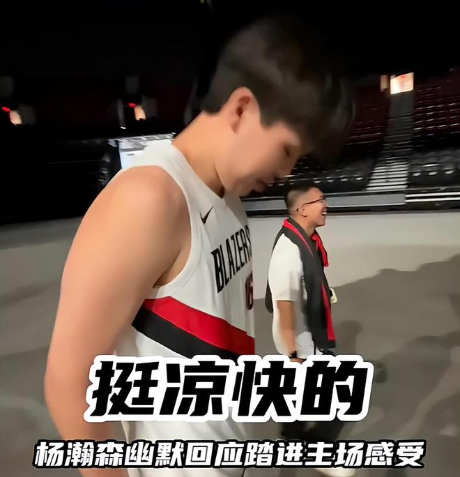 在发布会后,杨瀚森又一次展现了自己的“杨氏幽默”。当时大家一起往球馆走,记者突然问杨瀚森,第一次穿着开拓者的球衣,走进开拓者的球馆,感觉怎么样?杨瀚森略加思索,然后用双手摸了摸胳膊,笑着说:感觉好凉快!然后翻译克里斯也重复了杨瀚森“发冷”的动作,说:feel so cool!然后大家全部哈哈大笑,因为熟悉英语的朋友都知道,这是玩了个一语双关,cool既有冷的意思,又有酷的意思,既冷又酷,这回答,绝了!