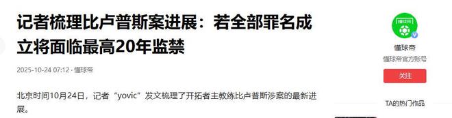 记者梳理比卢普斯案进展:若全部罪名成立将面临最高20年监禁 2025-10-24 07:12·懂球帝