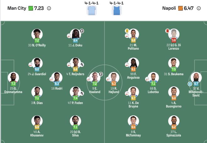 那不勒斯(4141):32-萨维奇;22-迪洛伦佐,31-布埃科马,4-布翁焦诺,37-斯皮纳佐拉;68-洛博特卡(72’6-吉尔莫);21-波利塔诺(55’5-热苏斯),99-安古伊萨,11-德布劳内(26’17-奥利维拉),8-麦克托米奈;19-霍伊伦(72’7-内维斯)