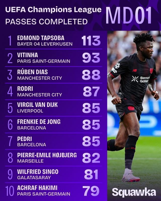 9月19日讯 欧冠首轮今日全部战罢,据Squawka的数据统计,勒沃库森后卫塔普索巴完成113次传球,传球准确率93%,另外他是本轮唯一完成传球次数100+的球员。