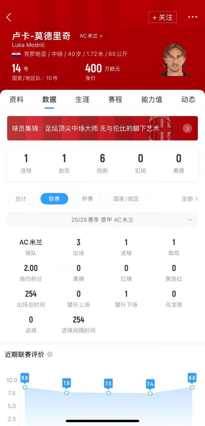 莫德里奇今夏加盟米兰,代表米兰出战4场正式比赛,其中意甲3轮1球1助,帮助米兰取得连胜。
