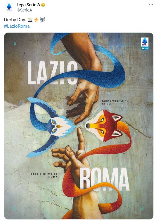 雷速体育9月21日讯 2025/26赛季意甲第4轮拉齐奥主场迎战罗马的比赛将于今天18:30打响。赛前,意甲官方在社交媒体晒出了这场第186次罗马德比的海报。拉齐奥与罗马的图腾“蓝