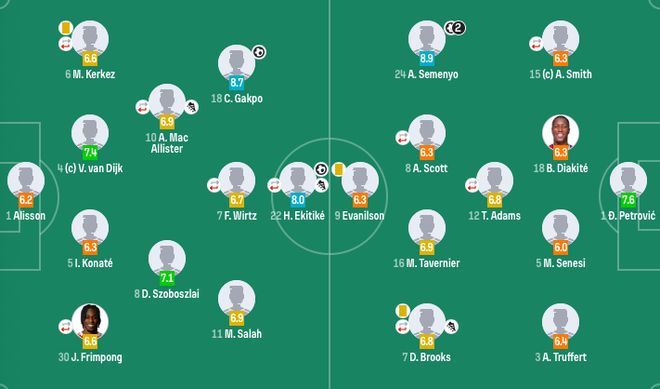 利物浦首发:1-阿利松、30-弗林蓬(60'3-远藤航)、5-科纳特、4-范戴克、6-科尔克兹(60'26-罗伯逊)、10-麦卡利斯特(72'17-琼斯)、8-索博斯洛伊、11-萨拉赫、7-维尔茨(82'14-基耶萨)、18-加克波、22-埃基蒂克(72'2-戈麦斯)