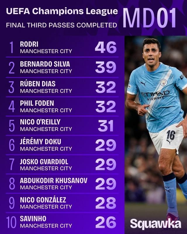 欧冠首轮进攻三区传球排行:罗德里46次居首,曼城球员包揽前十