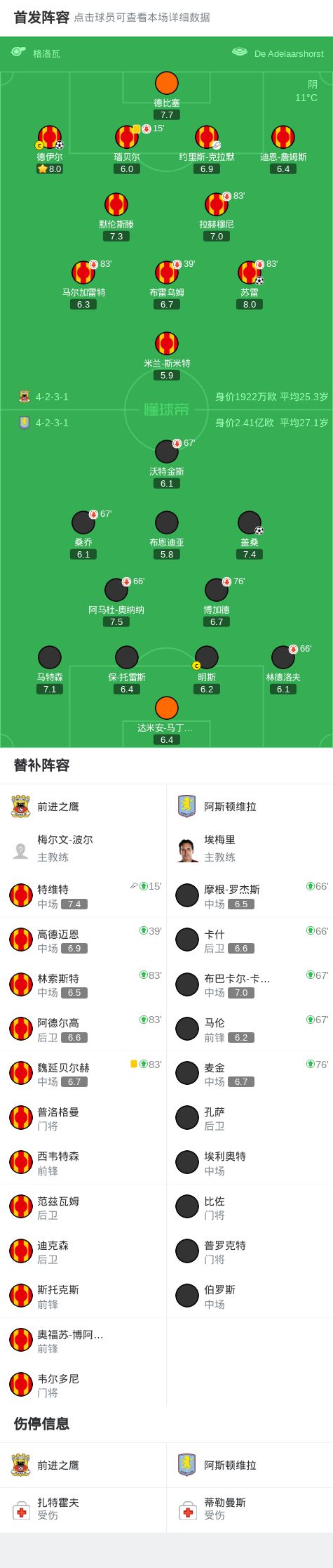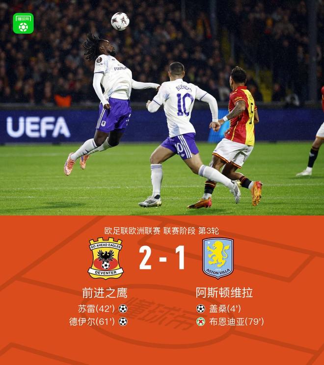 北京时间10月24日欧足联欧洲联赛 联赛阶段 第3轮,前进之鹰对阵阿斯顿维拉。上半场盖桑开场闪击,半场尾声特维特开出任意球,苏雷折射破门扳平比分。下半场约里斯-克拉默助攻德伊