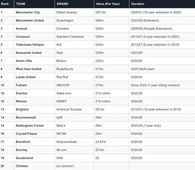 尽管2023年切尔西在新赛季开始一个月后成功与美国新锐科技公司Infinite Athlete达成超4000万英镑的合作,但也仅仅合作一个赛季便草草结束。切尔西在2024-25赛季的大部分时间都陷入“裸奔”窘境,直至赛季末迪拜房地产开发商Damac签下短期赞助协议,以700万买下赛季剩余7场比赛的胸前广告位。而在训练场上,切尔西球员胸前也有加密货币公司BingX以1100万英镑价格入局,这一价位在英超已然与富勒姆等中下游球队的胸前广告价位对等。