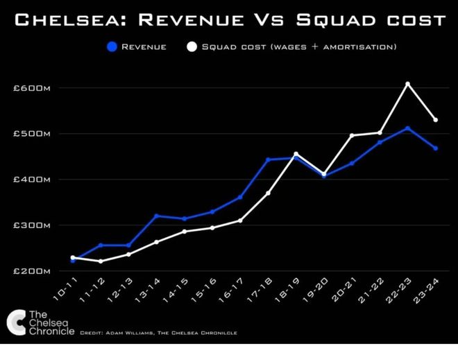 随着英超近日通过全新财务规则SCR(阵容成本比)取代之前的PSR(盈利与可持续规则)后,俱乐部需要将阵容成本控制在收入和球员转会净值的85%之内,资产出售不再被允许,切尔西之前出售旗下酒店和女足球队来规避财务违规的套路将不再合规。而下赛季开始英超也将全面叫停博彩广告投放,切尔西在胸前广告的选择空间和时间都不断被压缩。对于商业开发到极致的英超而言,球衣胸前广告位堪称重要商业资源,出现空置更是难以想象的资源浪费。空置时间越长,俱乐部承受的财政损失和压力也越大。